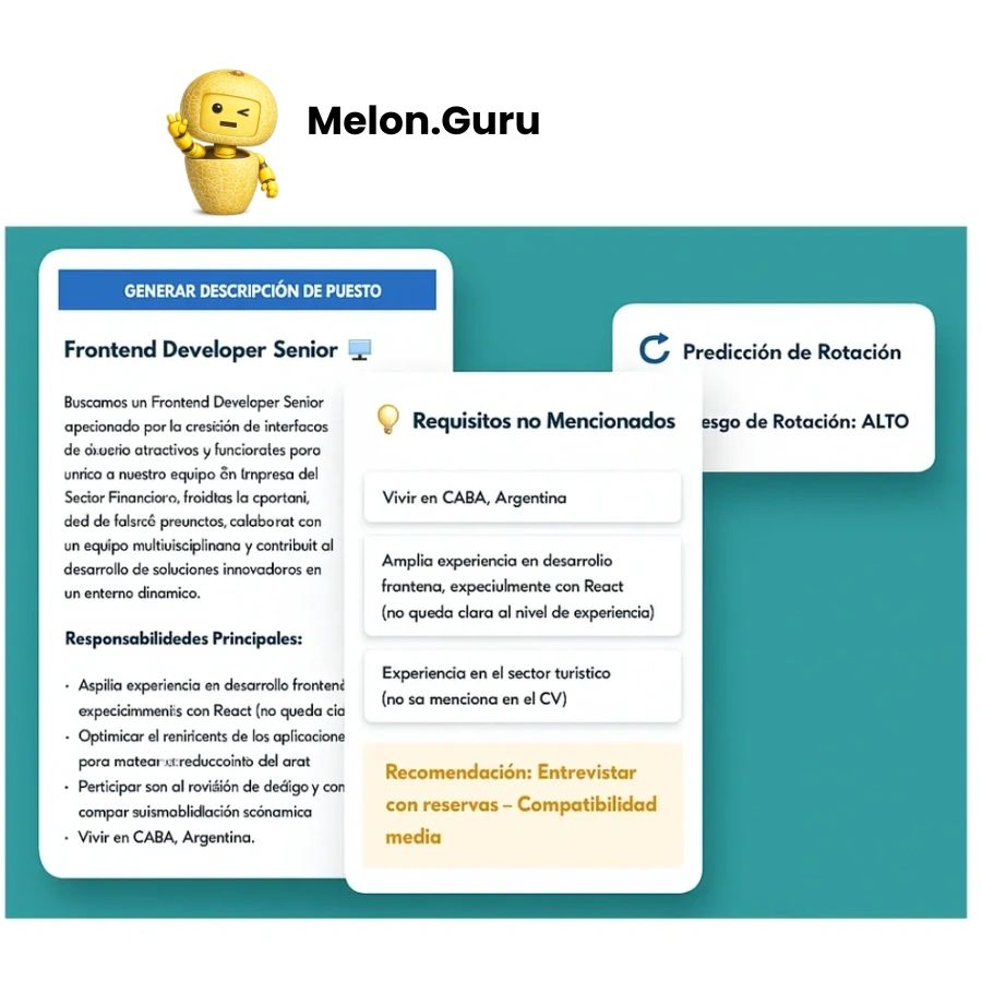 Luego, implementamos tu motor de talento con IA, que automatiza la descripción de puestos, el sourcing y el análisis de candidatos, optimizando tu proceso de selección.